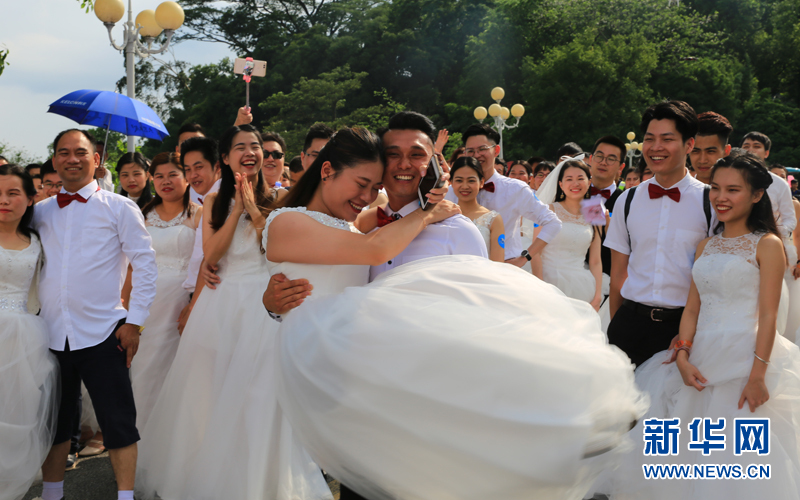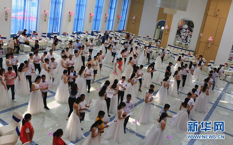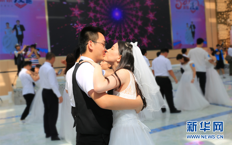 当天,99对新人穿上婚纱、系上领结,在亲朋好友的见证下进行集体爱情宣誓,新人们在此互相祝福,相爱终生、不离不弃。新华网发